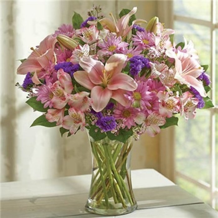 Creates a breathtaking and versatile bouquet. The soft, pastel tones of the flowers complement each other perfectly. With selected purple daisy poms, white waxflower and purple statice, along with Asiatic lilies and alstroemeria, both in pink. This arrangement is truly a floral treasure.